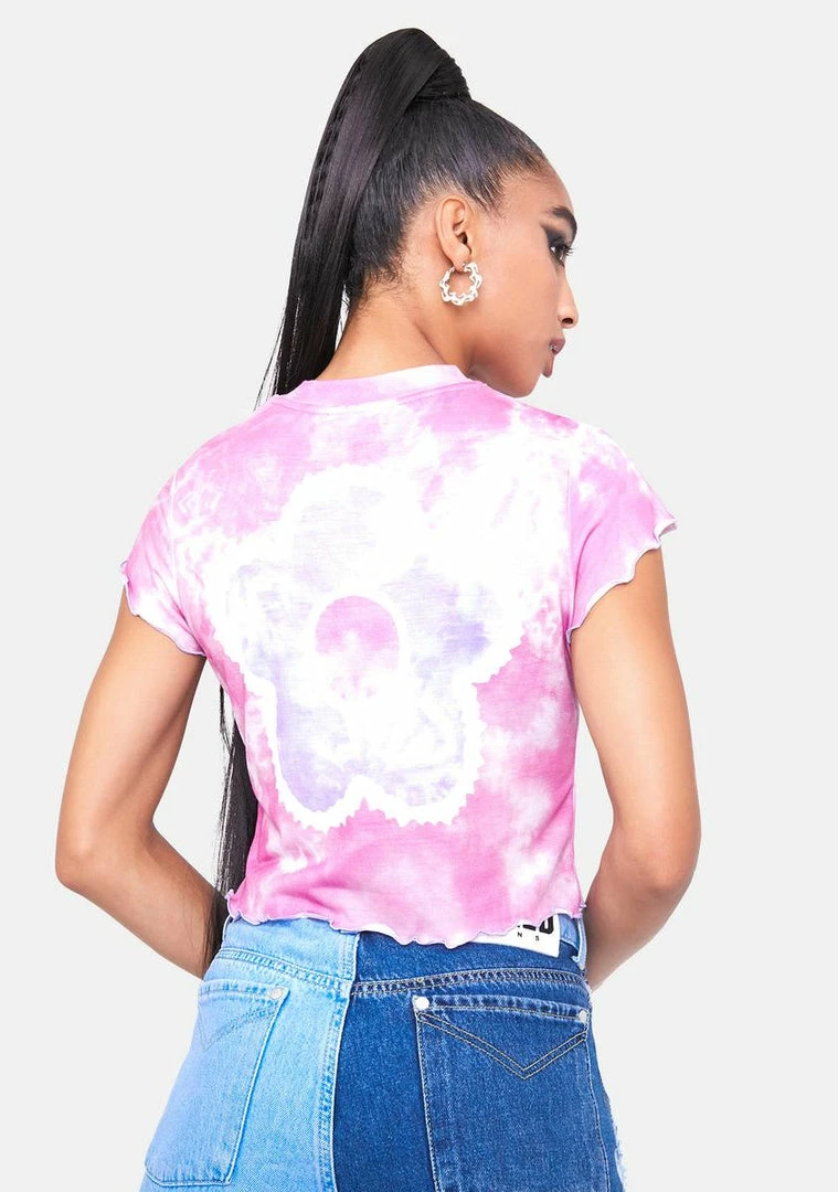 has a cropped waist, cap sleeves, lettuce trim, a tie dye print, and a central flower detail.