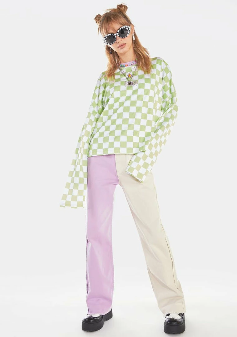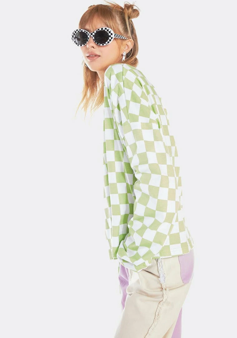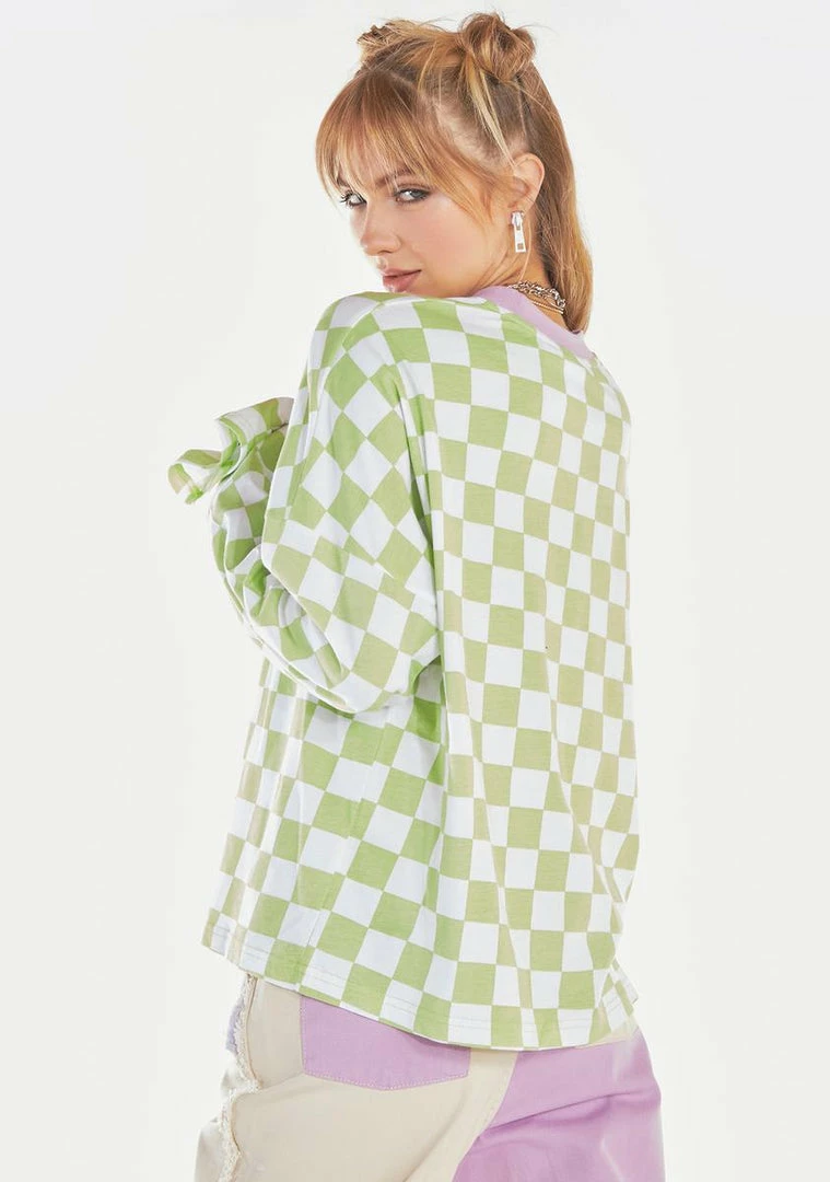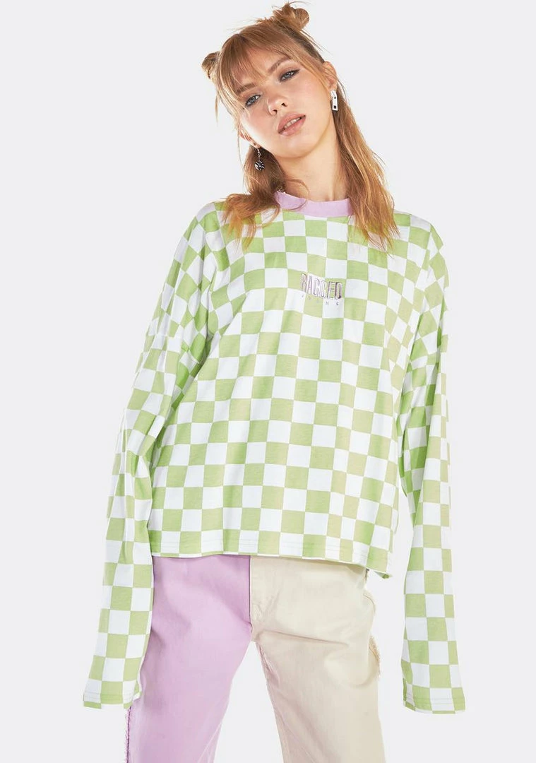 has long sleeves, a relaxed fit, a contrast colored crew neckline, a checkerboard print, and Ragged Priest embroidered on the front.