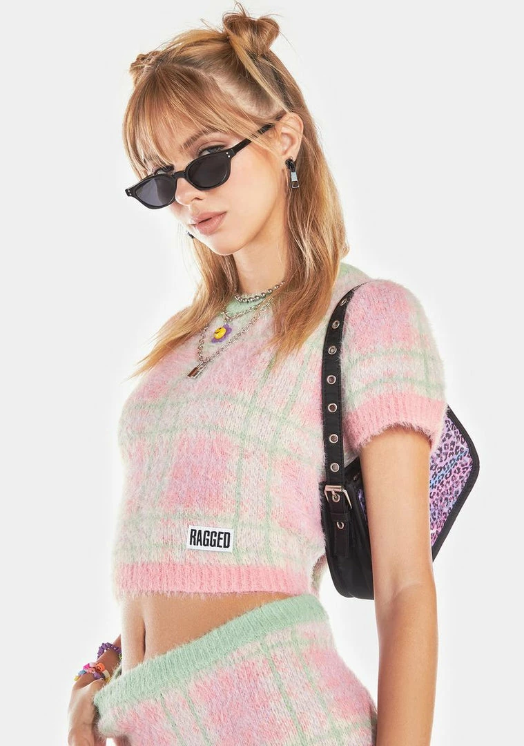 has a fuzzy eyelash knit construction, ribbed trim at the cuffs and crew neckline, a cropped waist, plaid pattern all over, and a Ragged Priest logo patch at the hem.