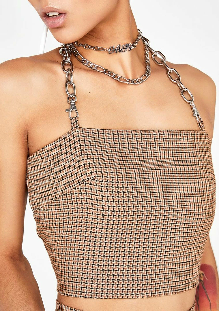 cuz youΓ’ΒΒre takinΓ’ΒΒ em higher bb. You got the fire in this cute AF tweed crop top that has chain halter neck NΓ’ΒΒ a hidden zip closure.