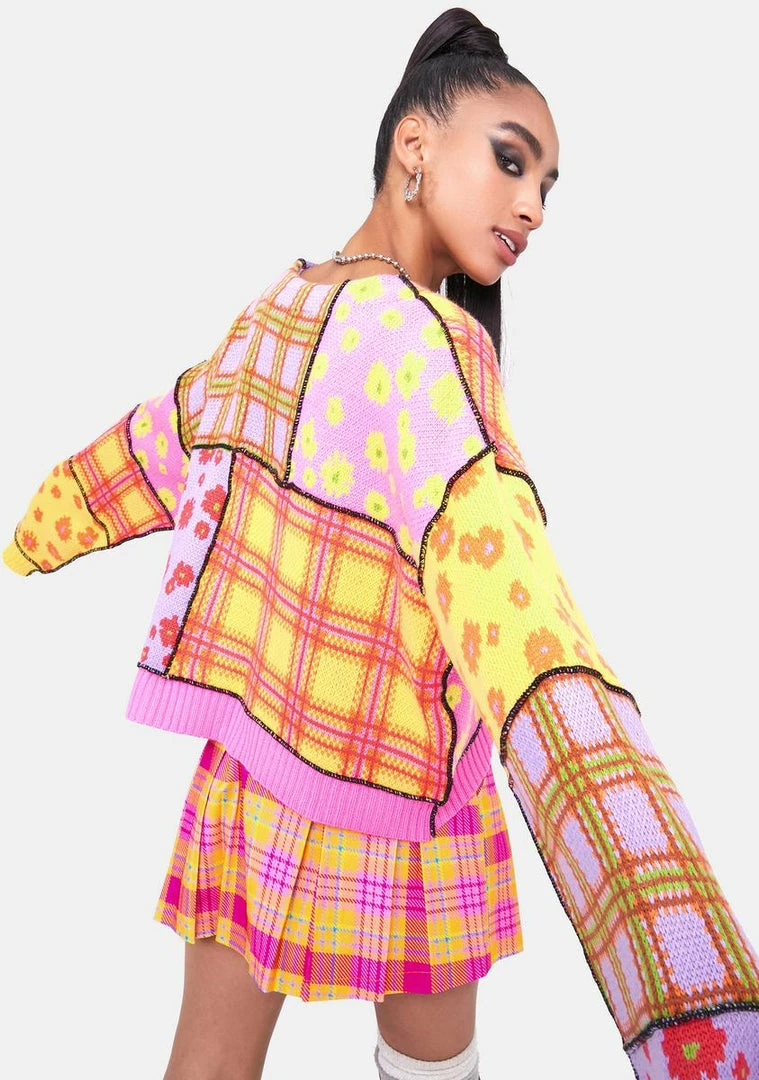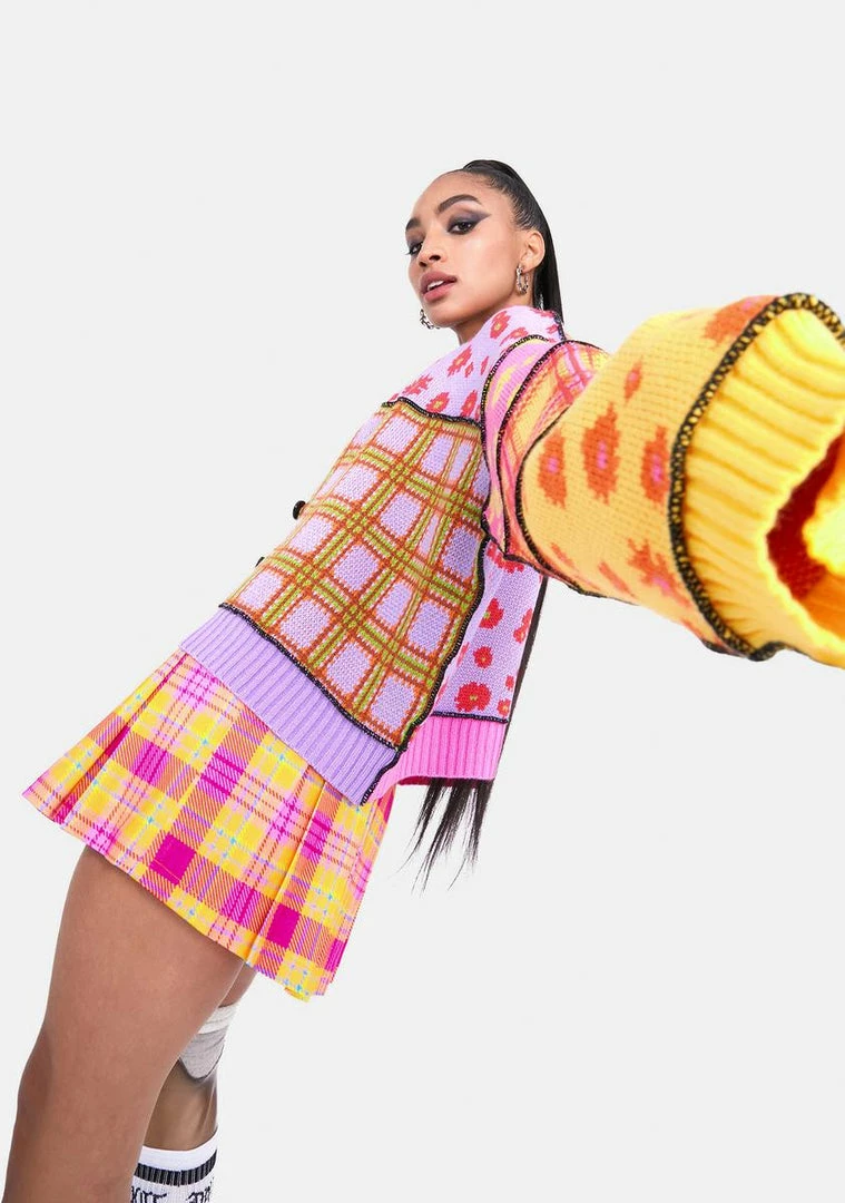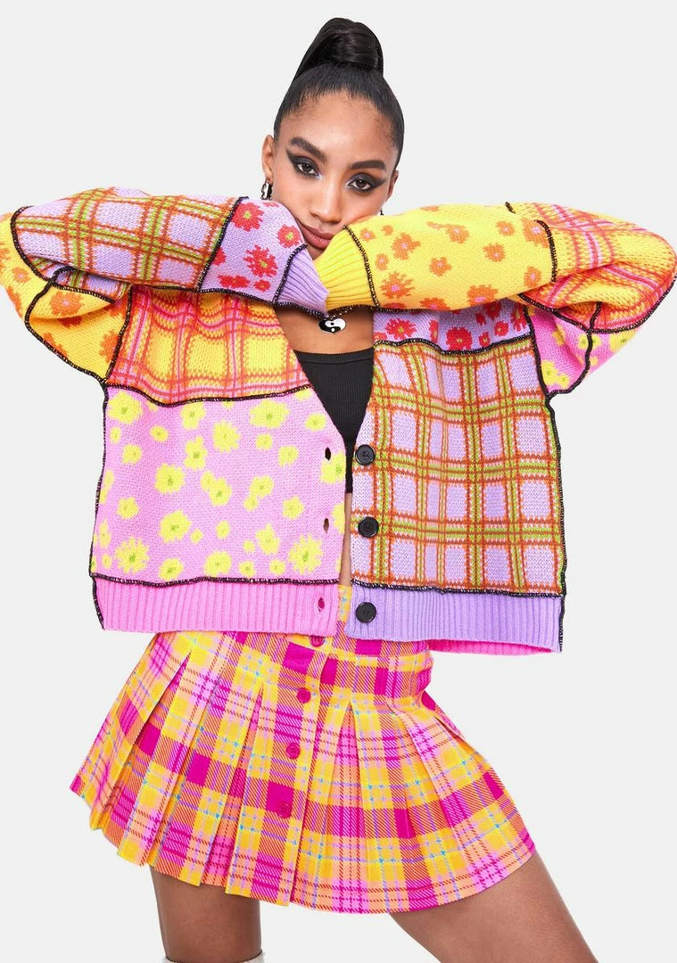 has an oversized fit, a patchwork design with contrast colored exposed seams and floral & plaid patterned patches, buttons up the front, and ribbed knit trim.