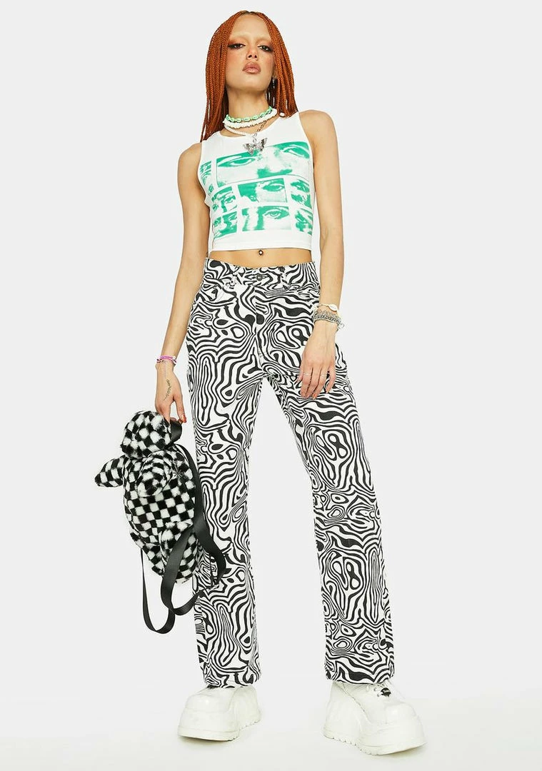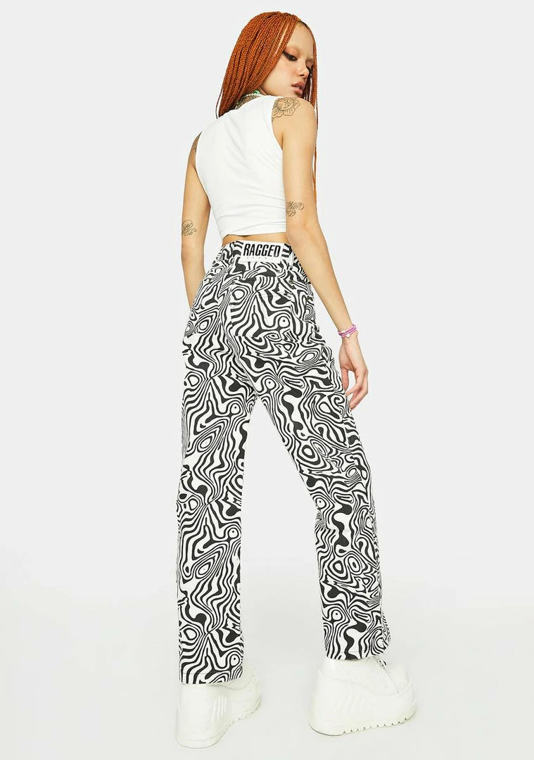 give ’em retro vibes. These baggy denim jeans have a trippy marble print all over, front and back pockets, and a zip-fly closure.