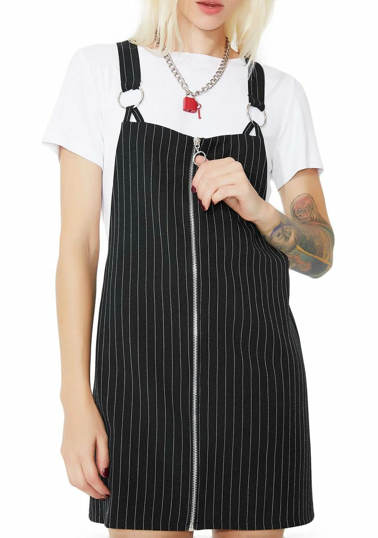 ya know misery loves company…this sweet pinstriped mini dress has a tiny bit of stretch to it, a relaxed fit, O-ring hardware and full-length zipper closure.