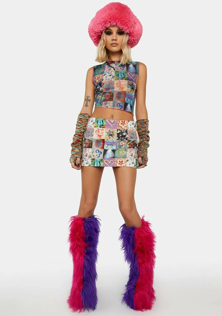 cuz you stand out from the crowd. This mini skirt has a cotton construction, an all over psychedelic patchwork graphic print design, a low rise fit, and a side zipper closure.