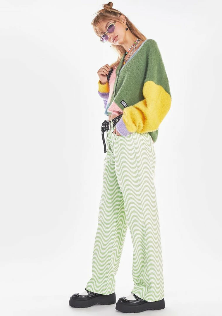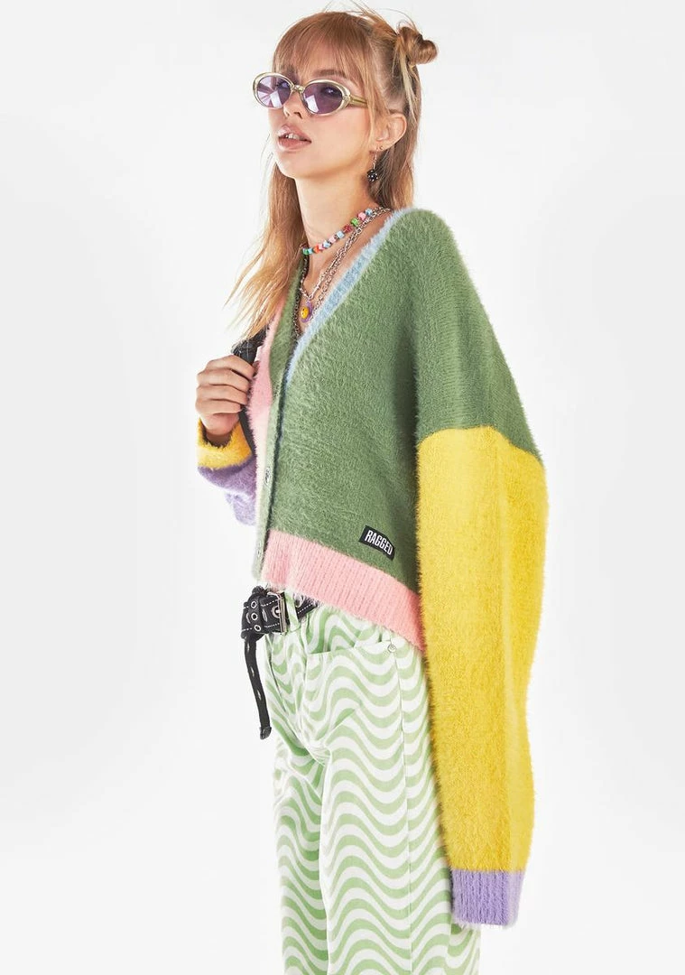 has an eyelash knit construction, ribbed trim at the cuffs and hem, a color block design, relaxed fit, and buttons up the front.