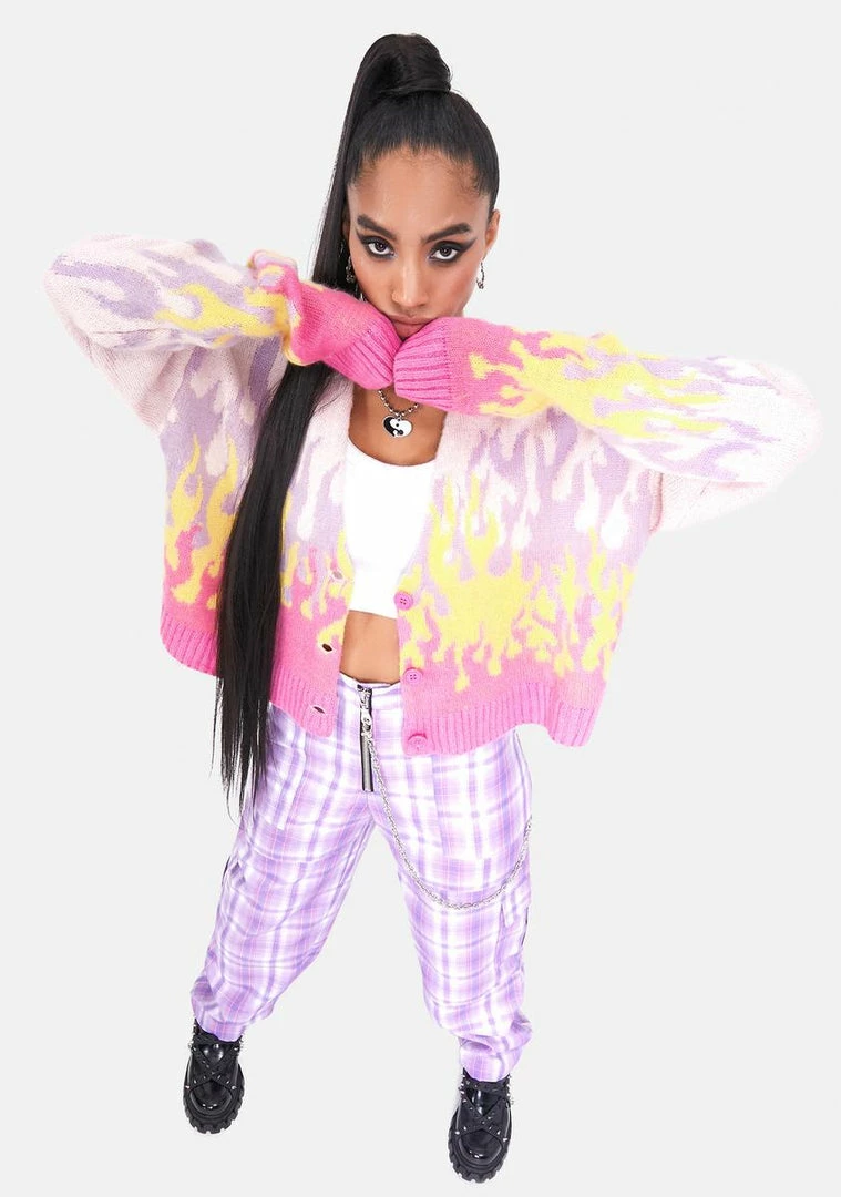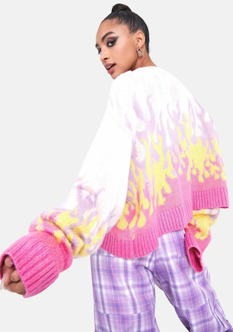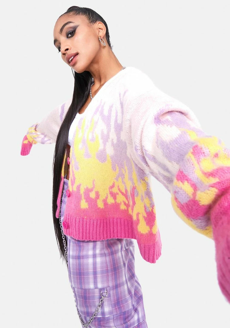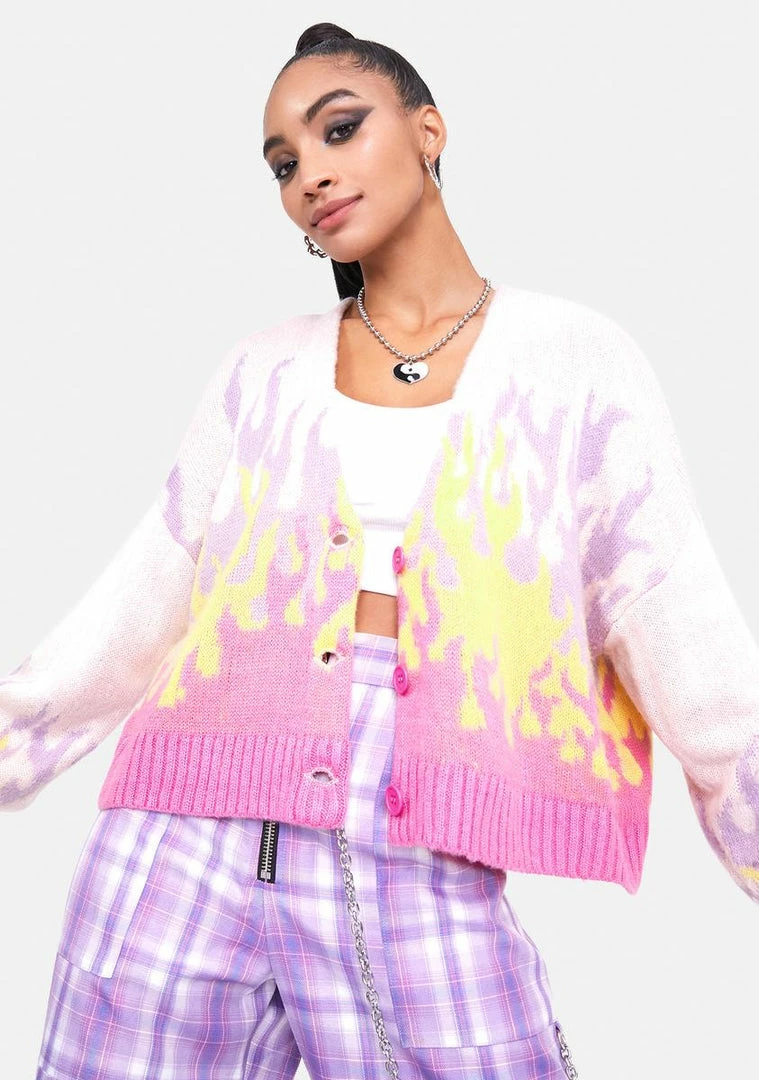 has an oversized fit, a multicolor flame intarsia design, ribbed knit trim at the cuffs and hem, and a button front closure.