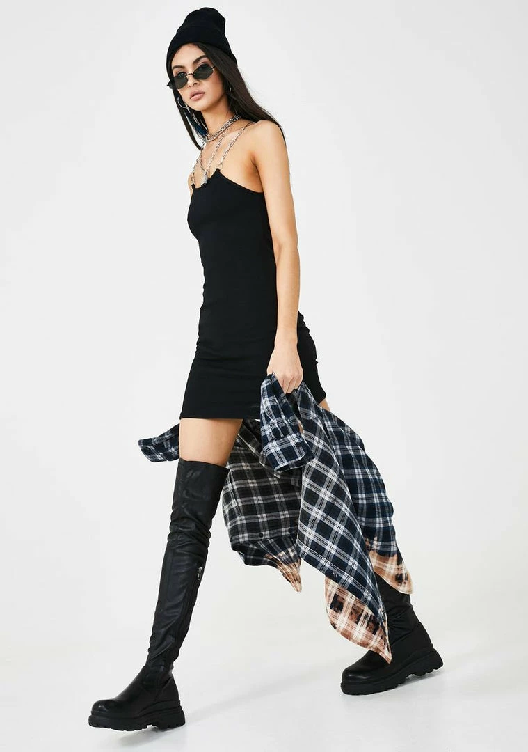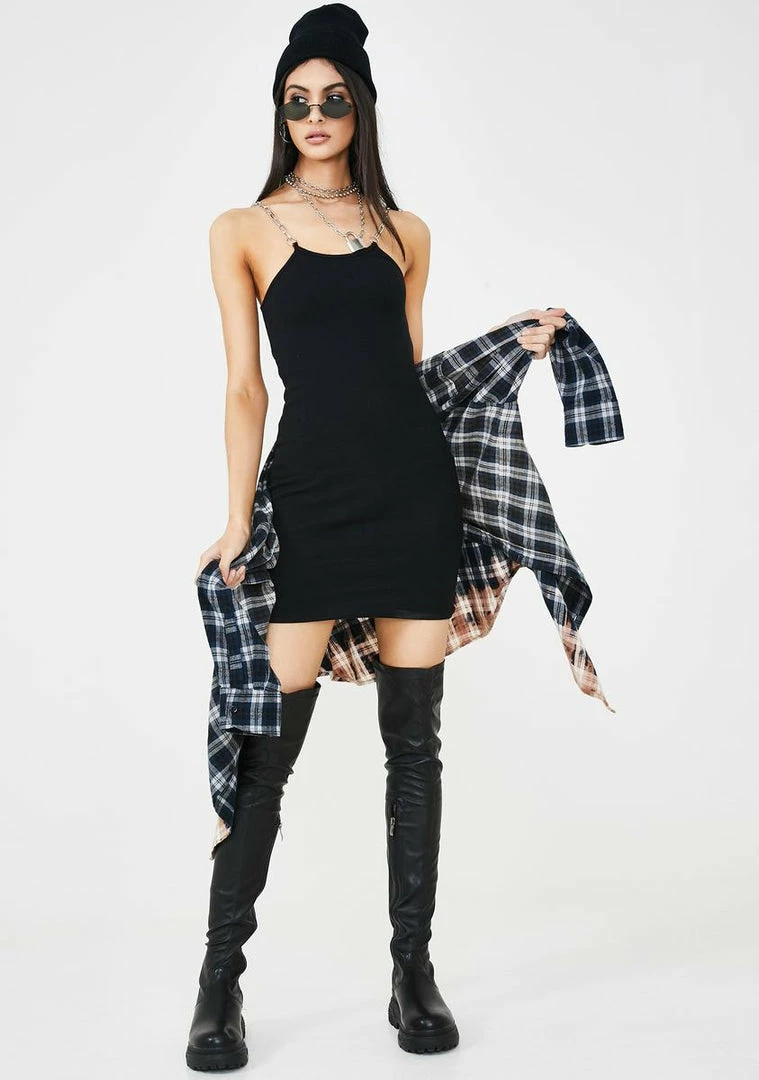 will have ya in control. You make the rulez in this mini cami dress that has a slim fit, chain straps, and a ribbed knit all ova.
