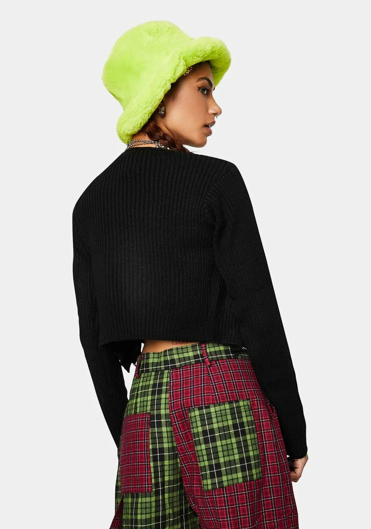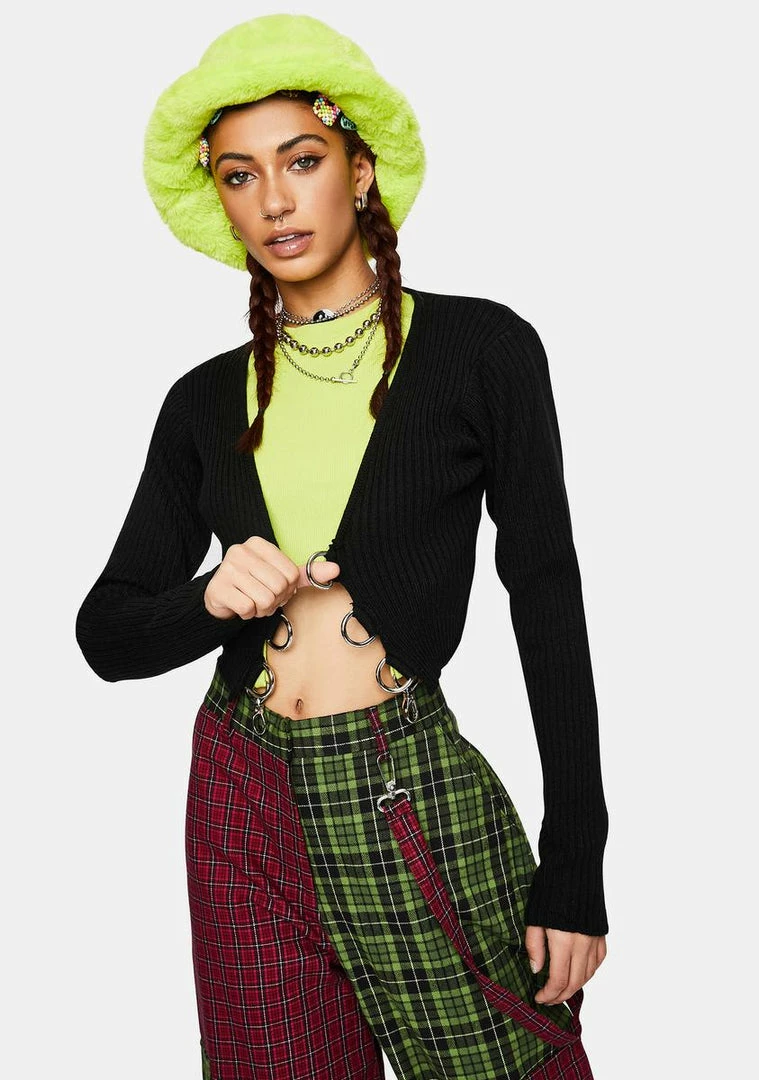 has long sleeves, a ribbed knit construction, and D-ring hardware with adjustable lace-up details.