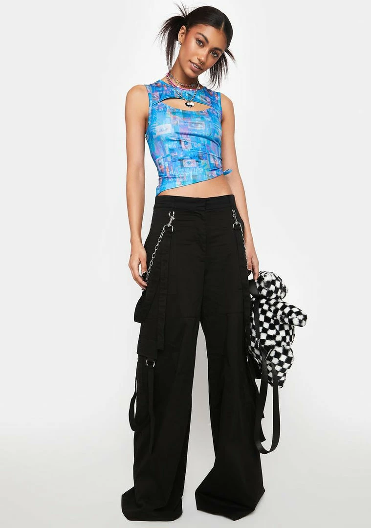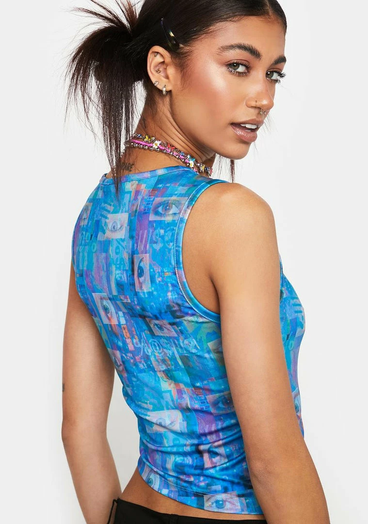 cuz youΓ’ΒΒre a cyber queen. This tank top has a stretchy lycra construction with a digital eye print all over, a cut-out on the front, and drawstring ties on the side.
