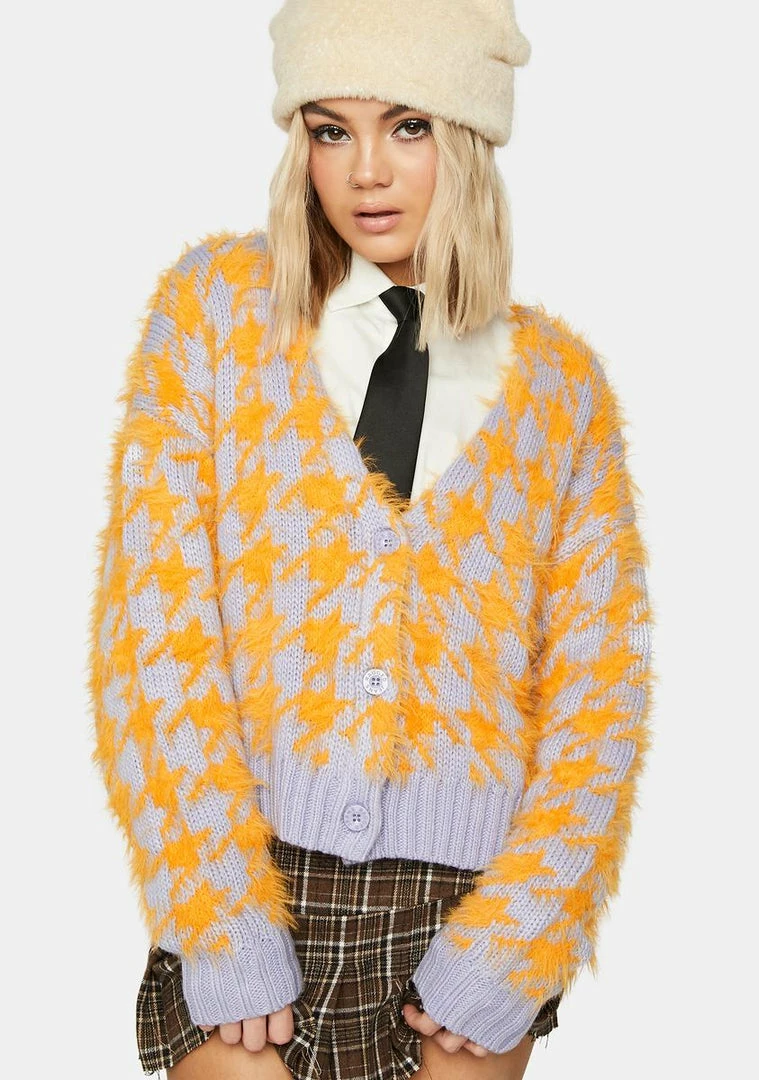 cuz you keep it sweet! This eyelash knit cardigan has a slightly oversized fit, button closures on the front, a plunge v-neckline, and a houndstooth pattern all over.