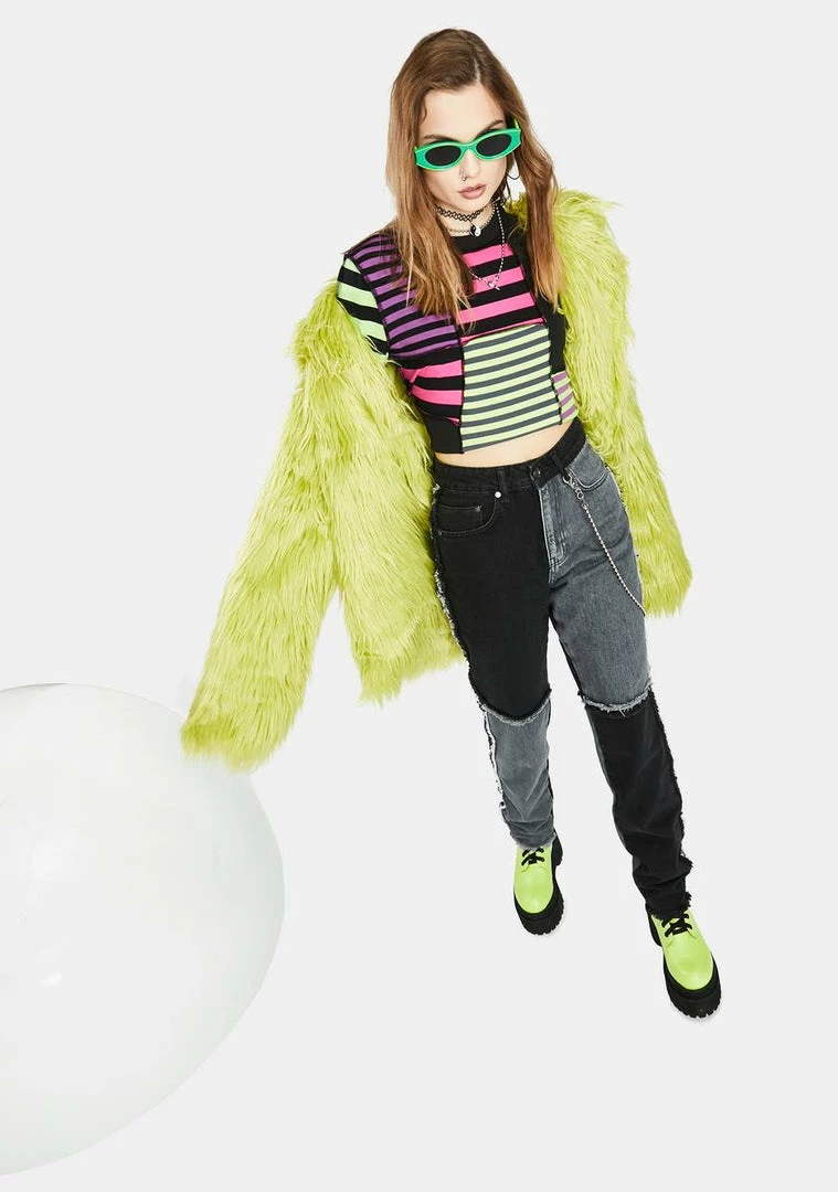 keep it happy. This crop top has a multi-colored neon stripe print and long sleeves.