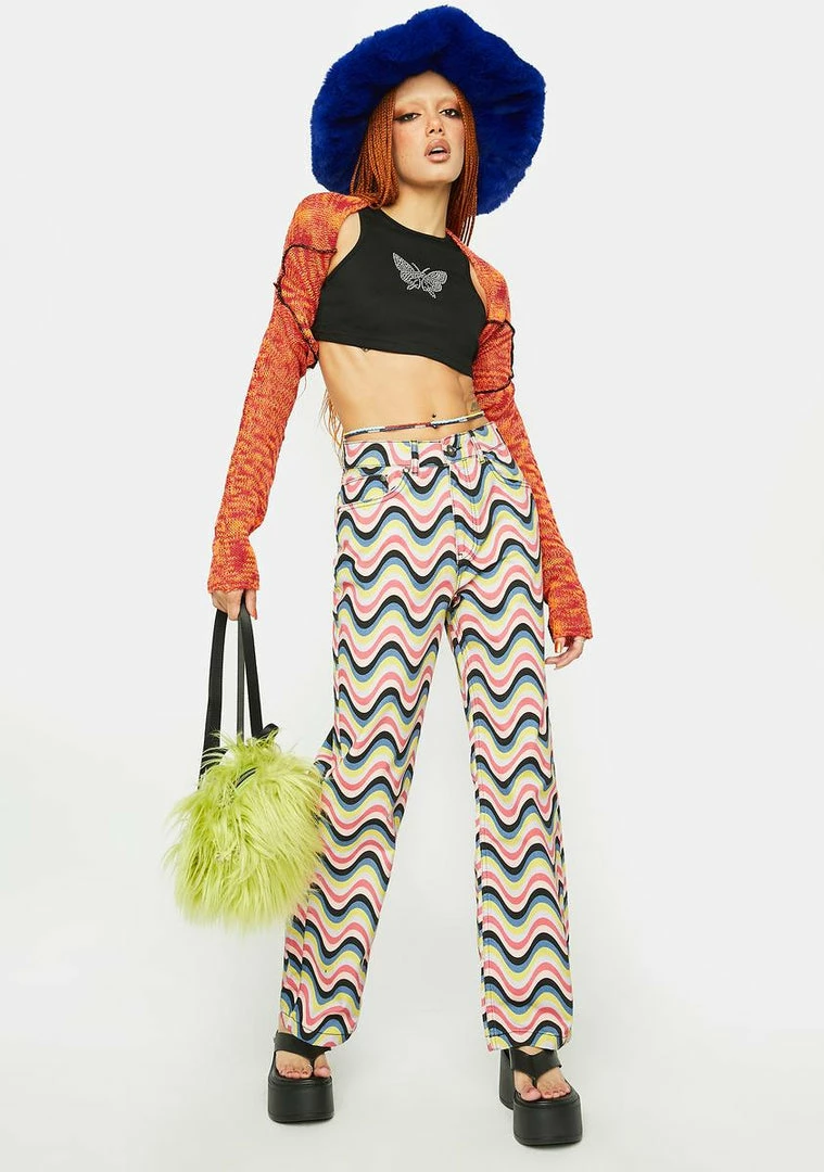 cuz you’re keeping it trippy, babe. These denim dad jeans have a high waist fit, relaxed legs, pockets on the front and back, and colorful wave print all over.