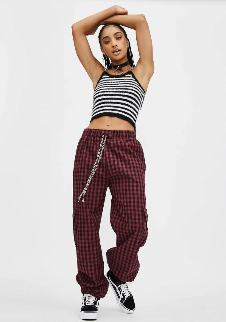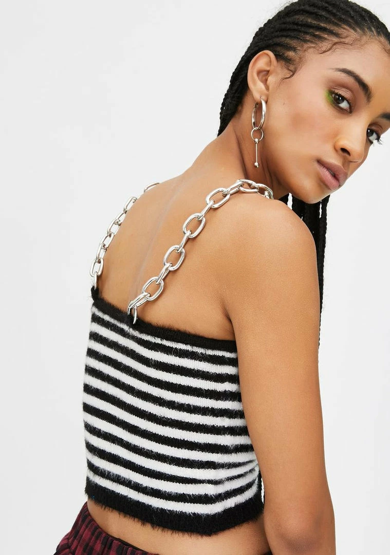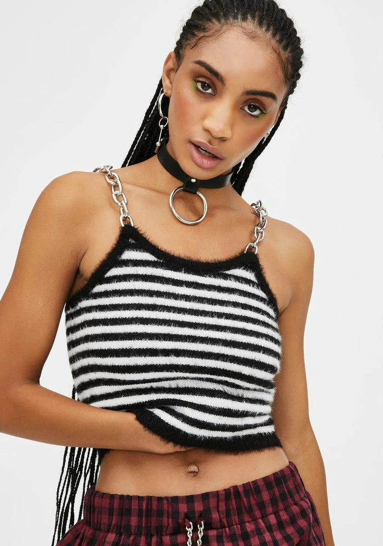 cuz you set the record straight! YouΓ’ΒΒre the baddest in this fuzzy knit cami top that has a cropped fit, chain straps, and a stripe pattern all ova.