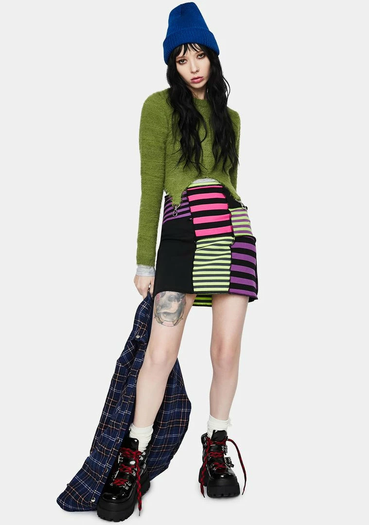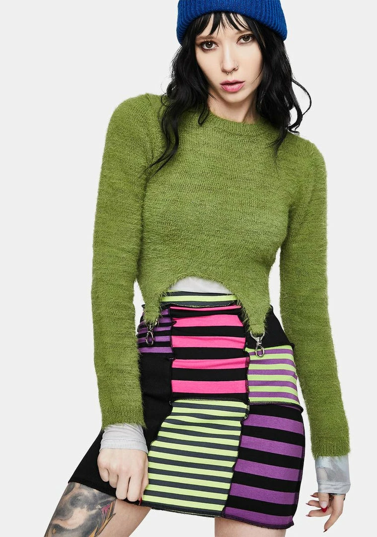 cuz you take it all the way back. This fuzzy knit crop top has long sleeves and trigger hook hardware straps.