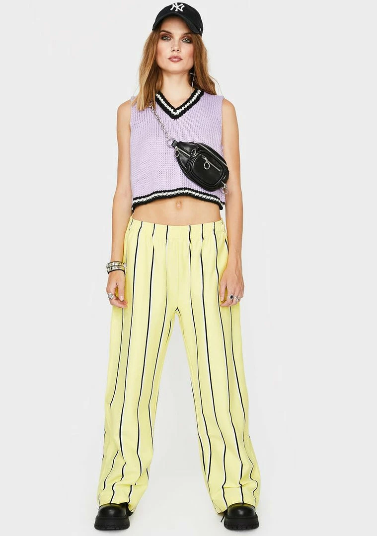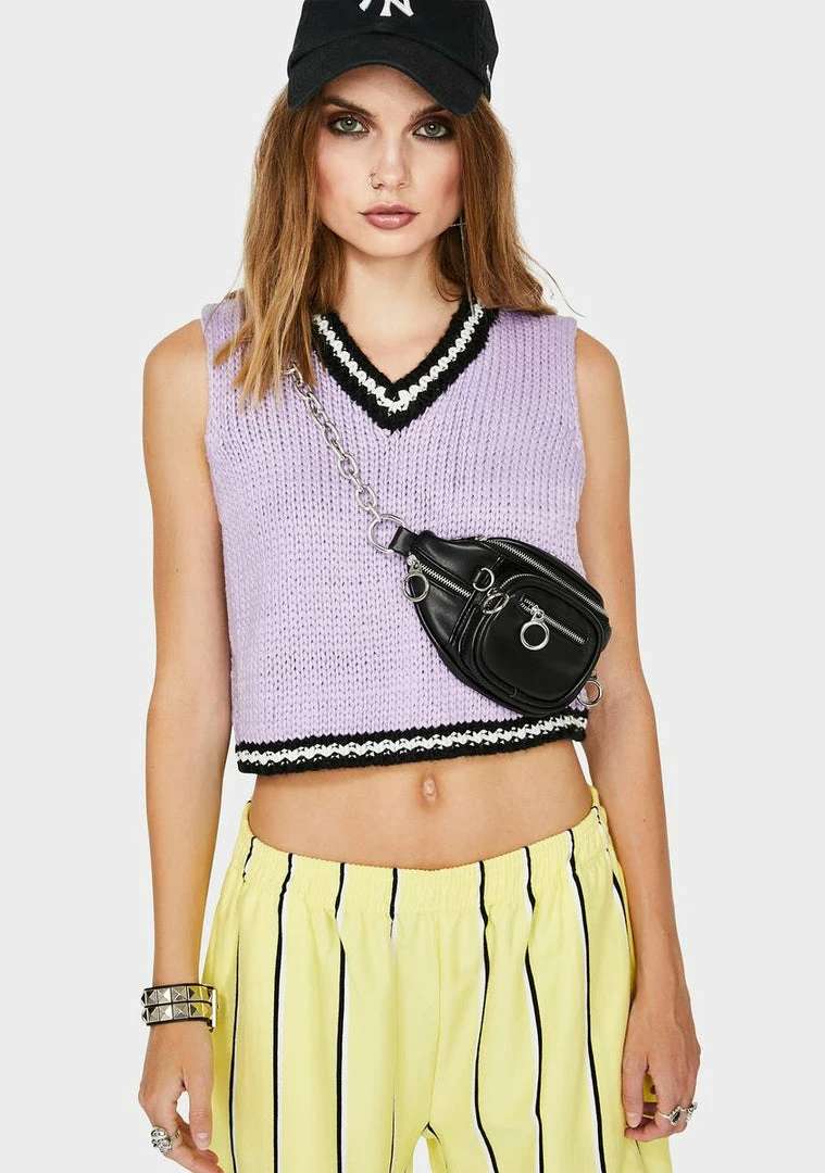 cuz ya do what it takes to stay relevant. This soft sweater vest has a thick ribbed knit with a V-neckline, cropped fit and contrast striped hems.