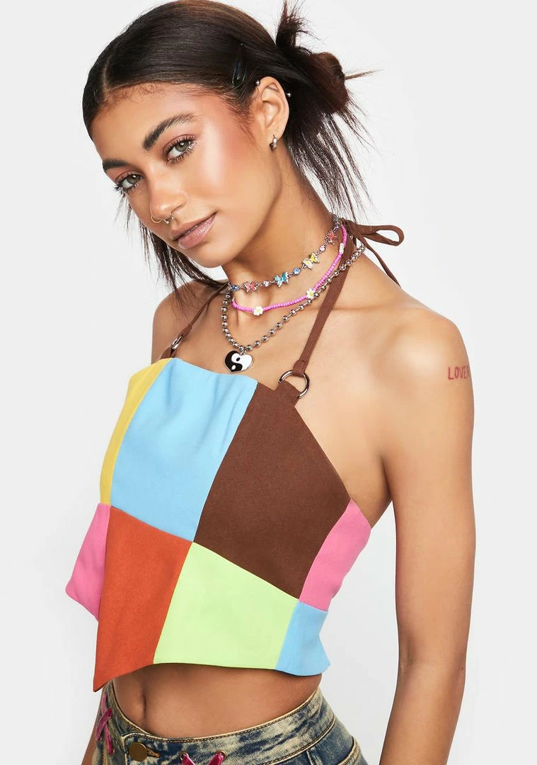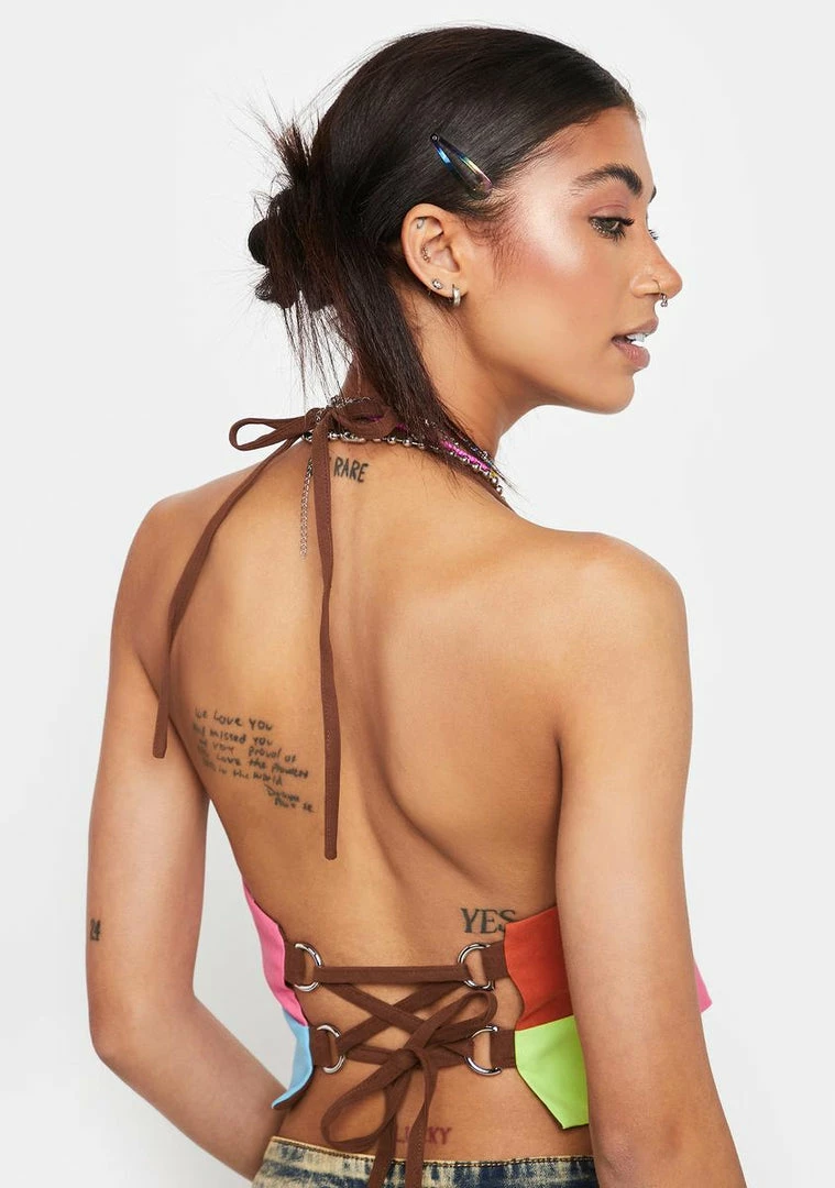 cuz it’s a wild time! This halter crop top has a rainbow patchwork construction, o-ring hardware, and an open back with adjustable lace-up closures.