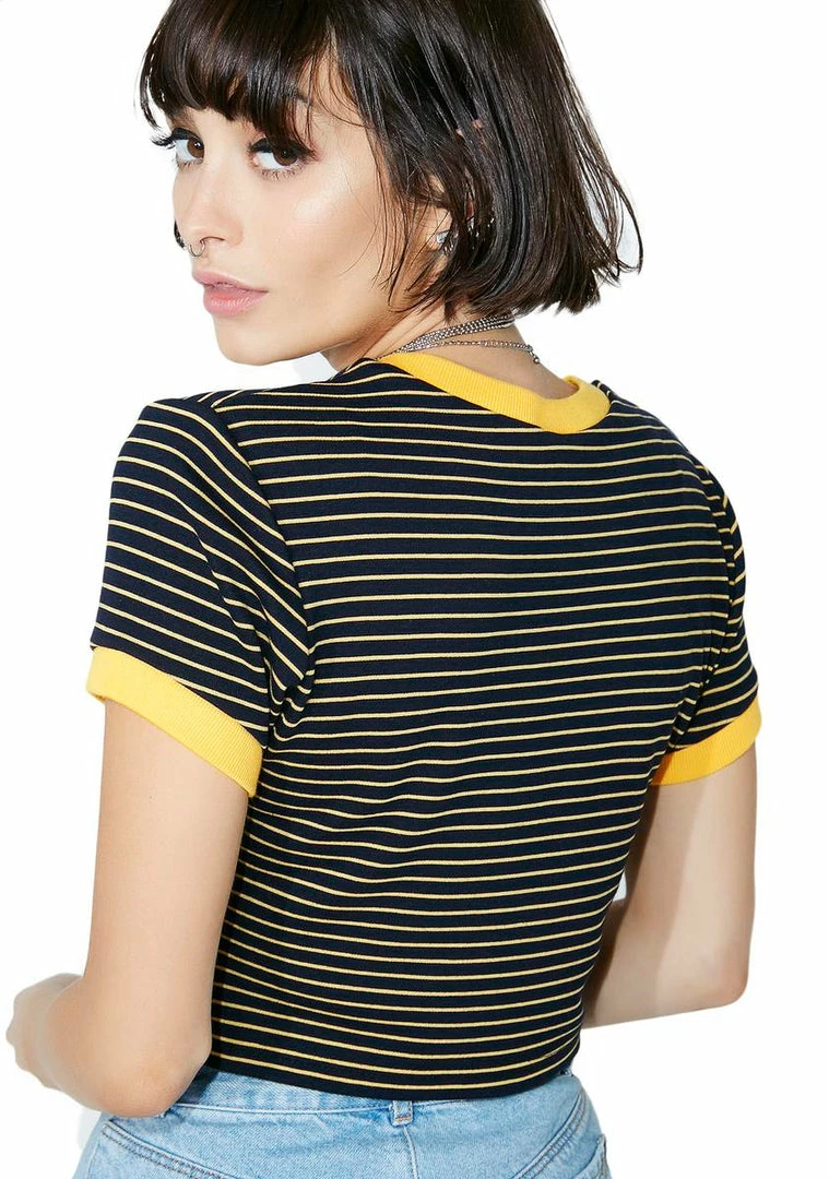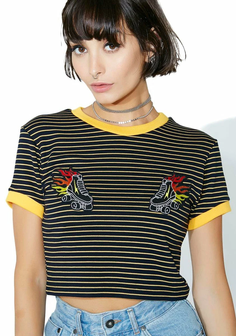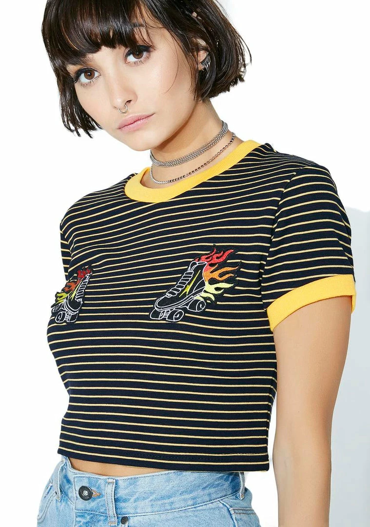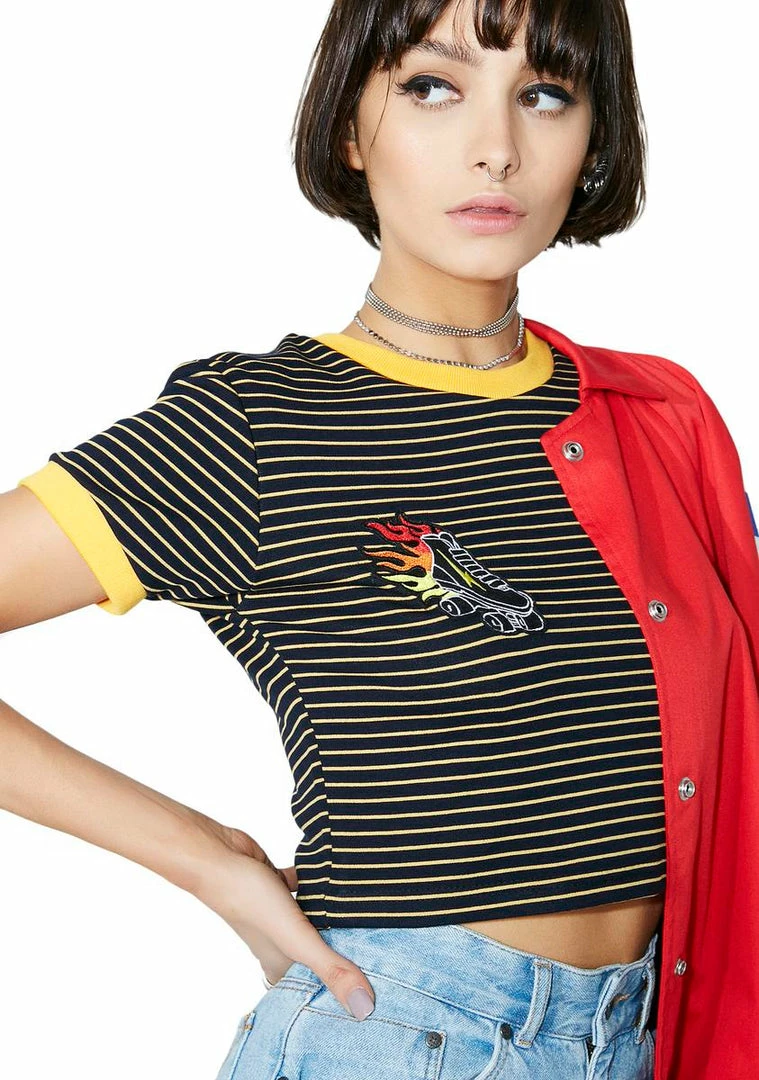 cuz we dig tough chicks, so you know weΓ’ΒΒre all about those derby girls! Jam down the track in this vintage-inspired tee featuring a soft NΓ’ΒΒ stretchy construction, embroidered flaming roller skate patches on the chest, cropped fit, allover stripe pattern and contrasting trim on the collar and sleeves.