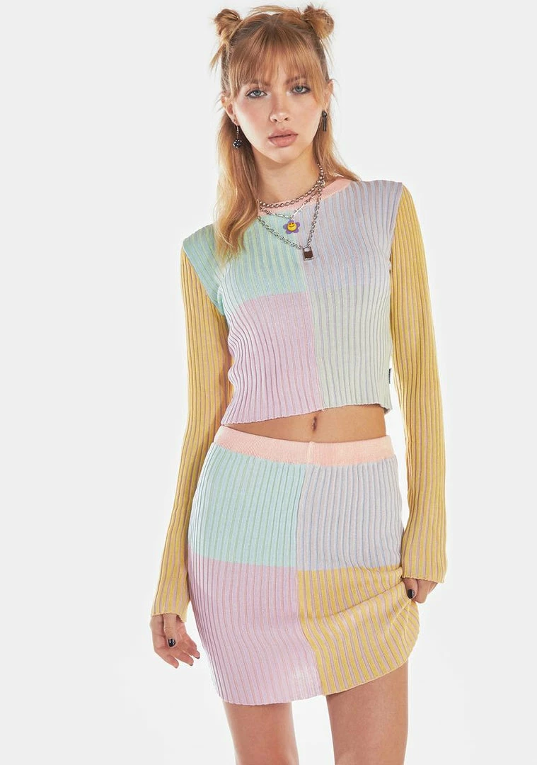 has a ribbed knit construction, a pastel color block checkered design, a bodycon fit, and a high rise waistline.