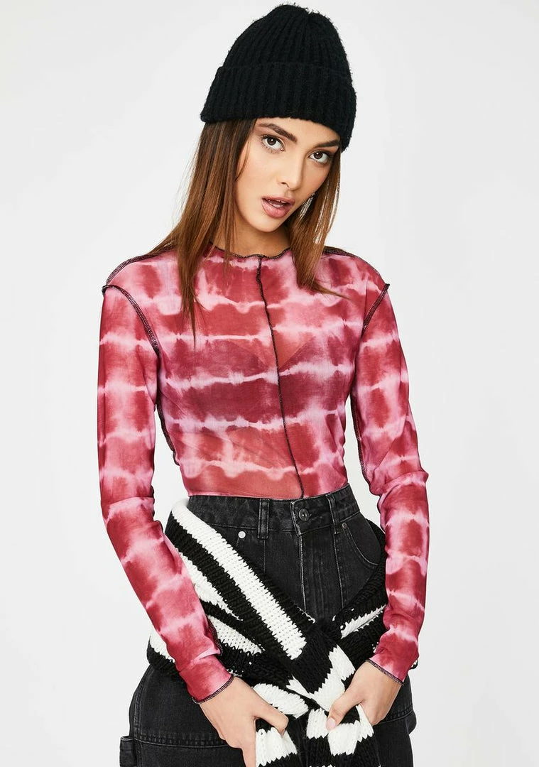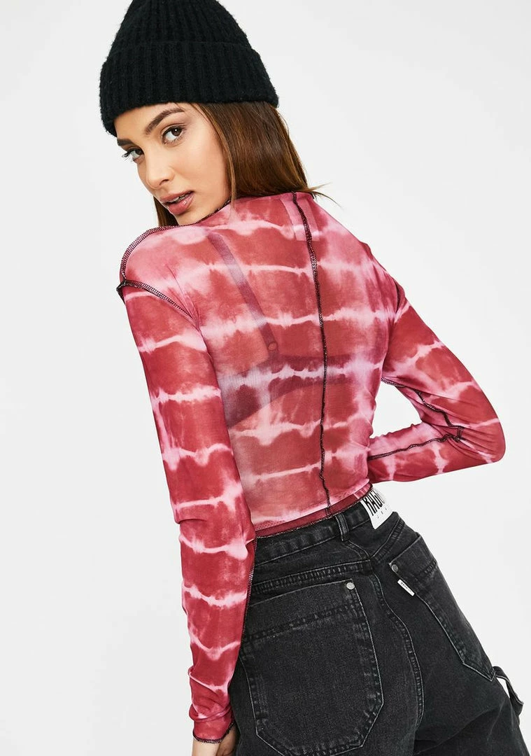 for when ya need to make a great escape! Chase the high in this long sleeve mesh top that has a cropped fit, an exposed seam design, and a tie dye print all ova.