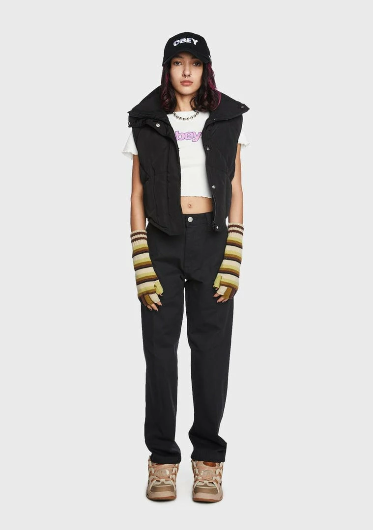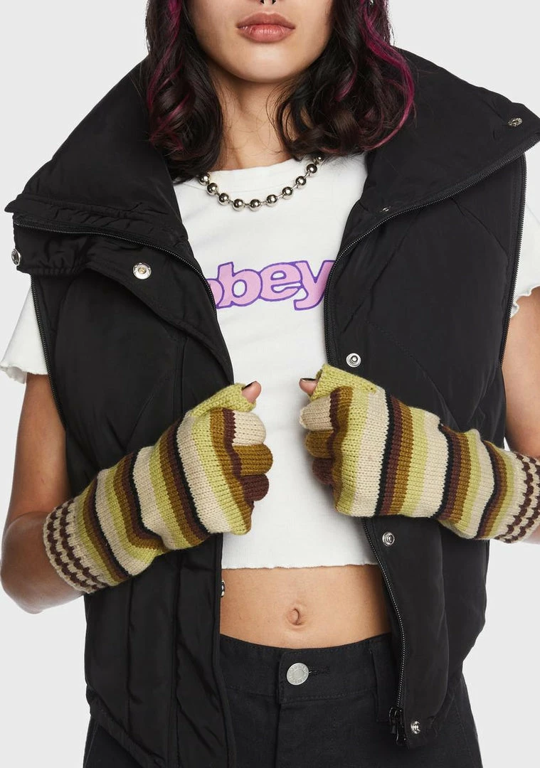 cuz you’re too cool to care. These fingerless gloves have a knit construction and a striped print all over.