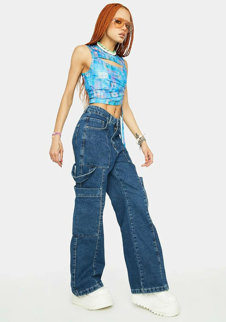 cuz you gotta switch things up! These wide leg denim jeans have cargo pocket details, a hanging loop strap, and a zip-fly closure.