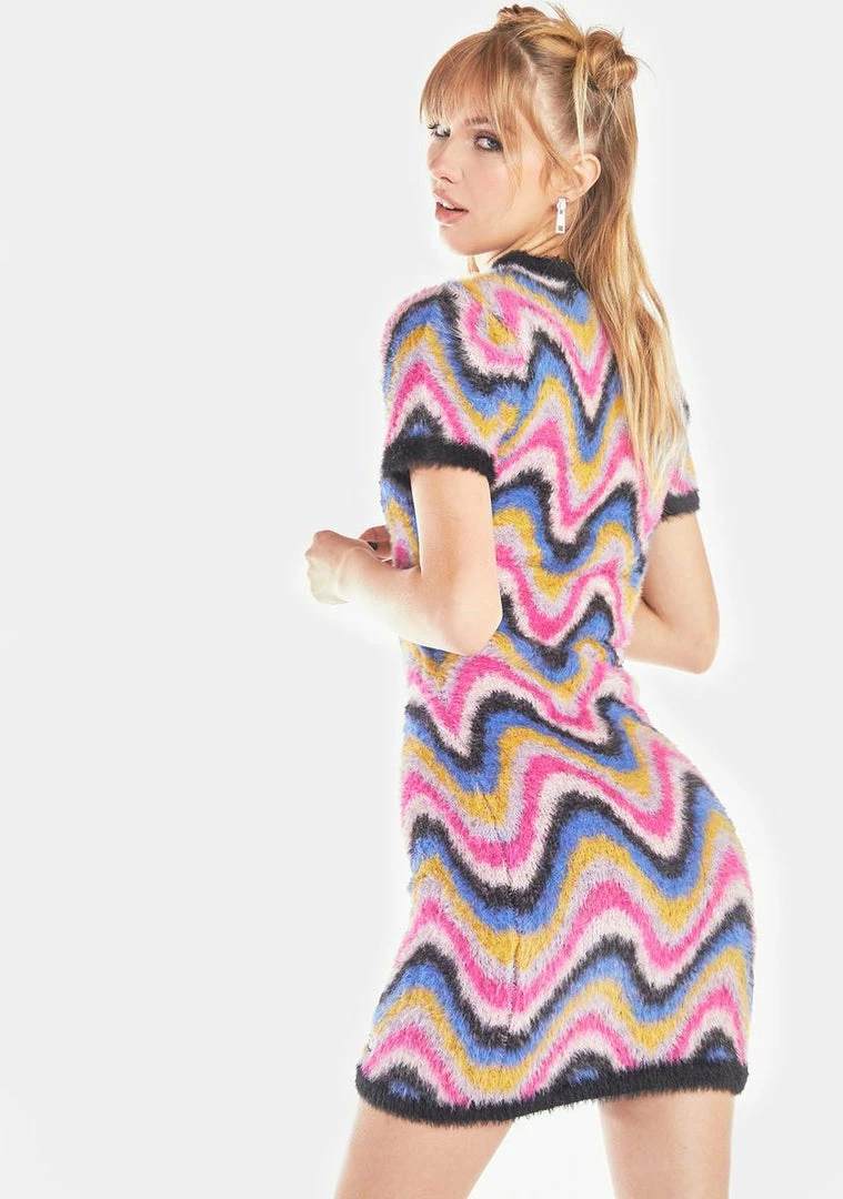 cuz I’d like to see you try me. This mini dress has a fuzzy knit construction, short cap sleeves, a crew neckline, an a-line fit, contrast colored trim at the neck, cuffs and hem, and a multicolored wavy print.