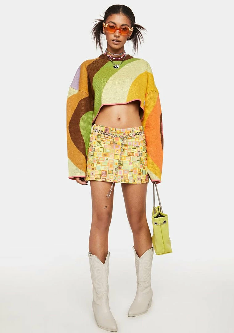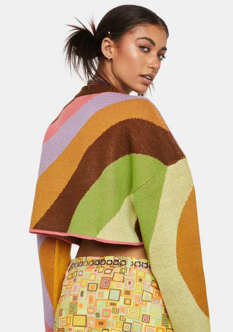 cuz you go with the flow. This cropped sweater comes in an oversized knit construction, with long sleeves, and a swirl print all over.