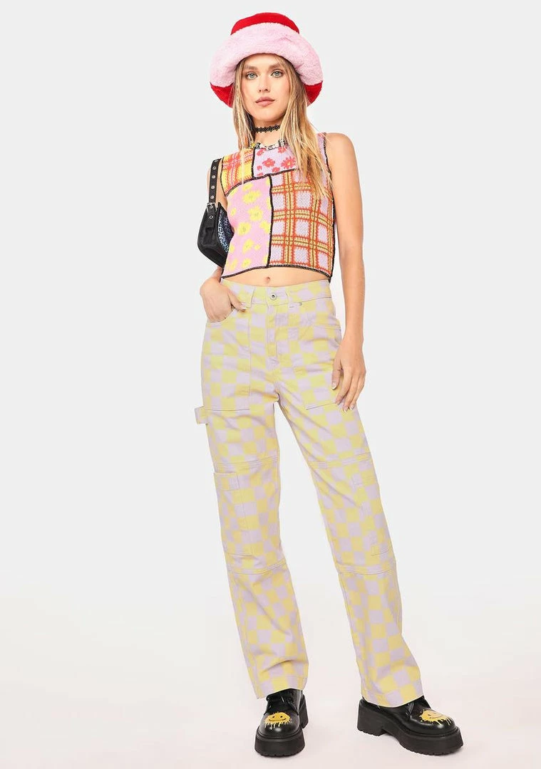 cuz youΓ’ΒΒre the main attraction! This knit crop top has a patchwork design with floral and plaid prints and contrast exposed seams.