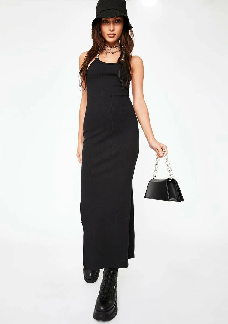 cuz they hate to watch ya leave. Blow a kiss their way in this ultra chic midi dress that has a ribbed material, a halter neckline, and a sexxxy open back with chunky chain straps.