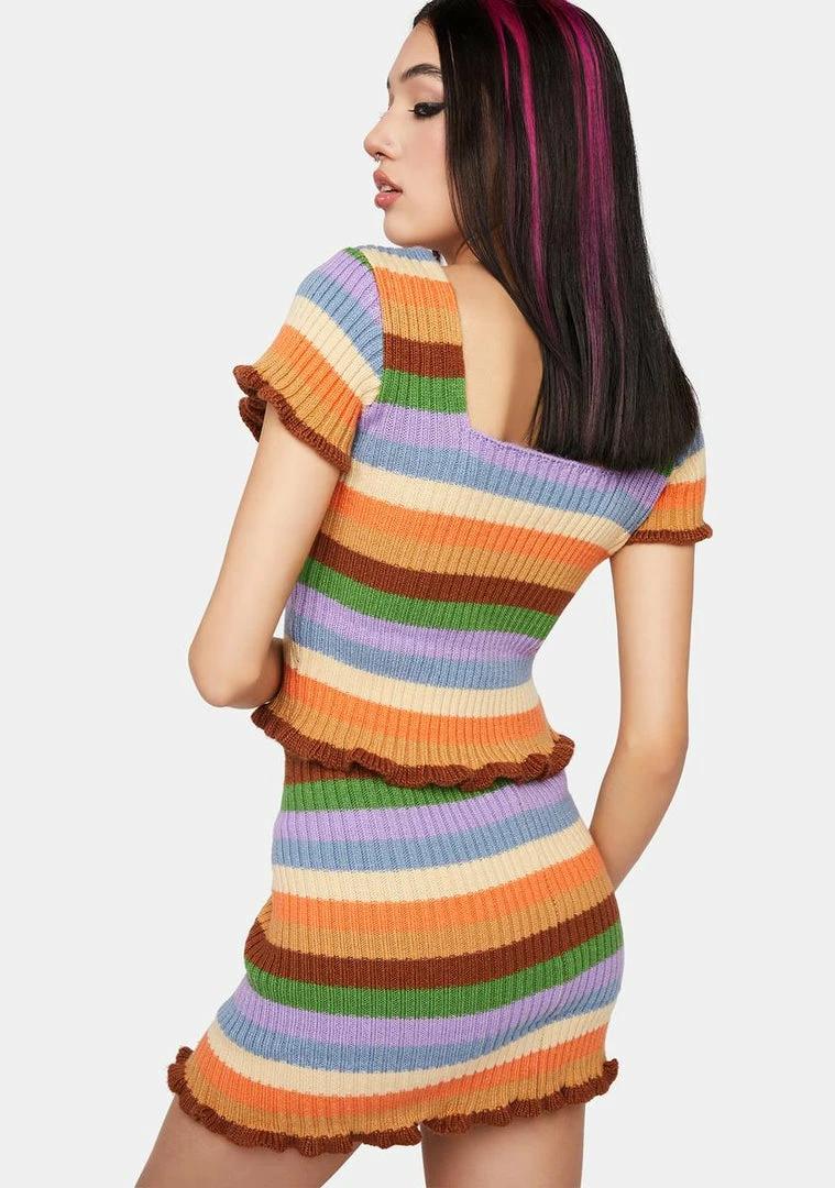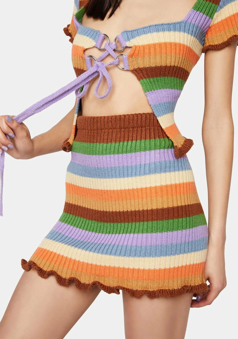 cuz you’re up til dawn. This mini skirt has a knit ribbed construction, a multicolored striped design, and a ruffled trim.