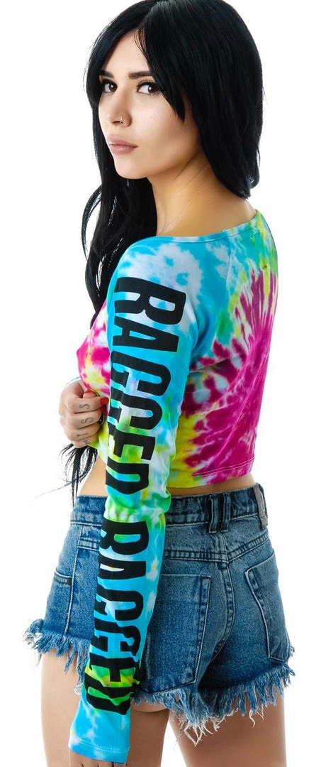The Ragged Priest Halle Long Sleeve Cropped Tee takes you to an acid trip wonderland with it’s 70’s vintage look by hand dying each tee, so no two will ever look identical. Melt the day away in this long sleeved cropped tee that features a sweet scoop neck, and sexy bodycon fit. Give any of your outfits that pop of color right away before it melts like rainbow ice cream.