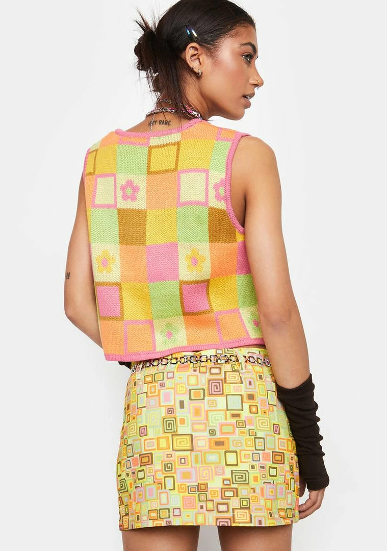 what’s this all about? This micro mini skirt has a detachable chain belt, a low rise fit, and a colorful retro print all over.