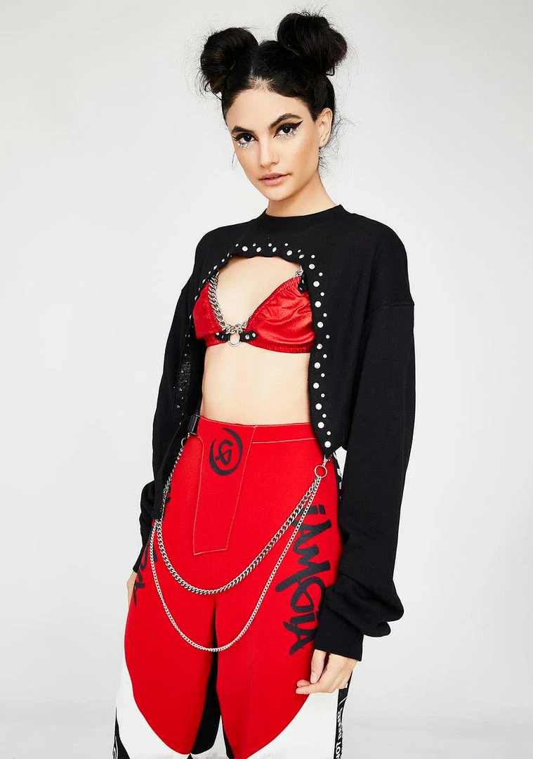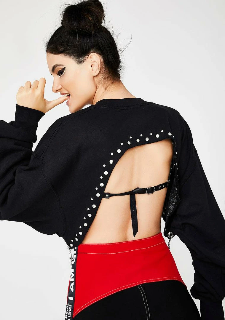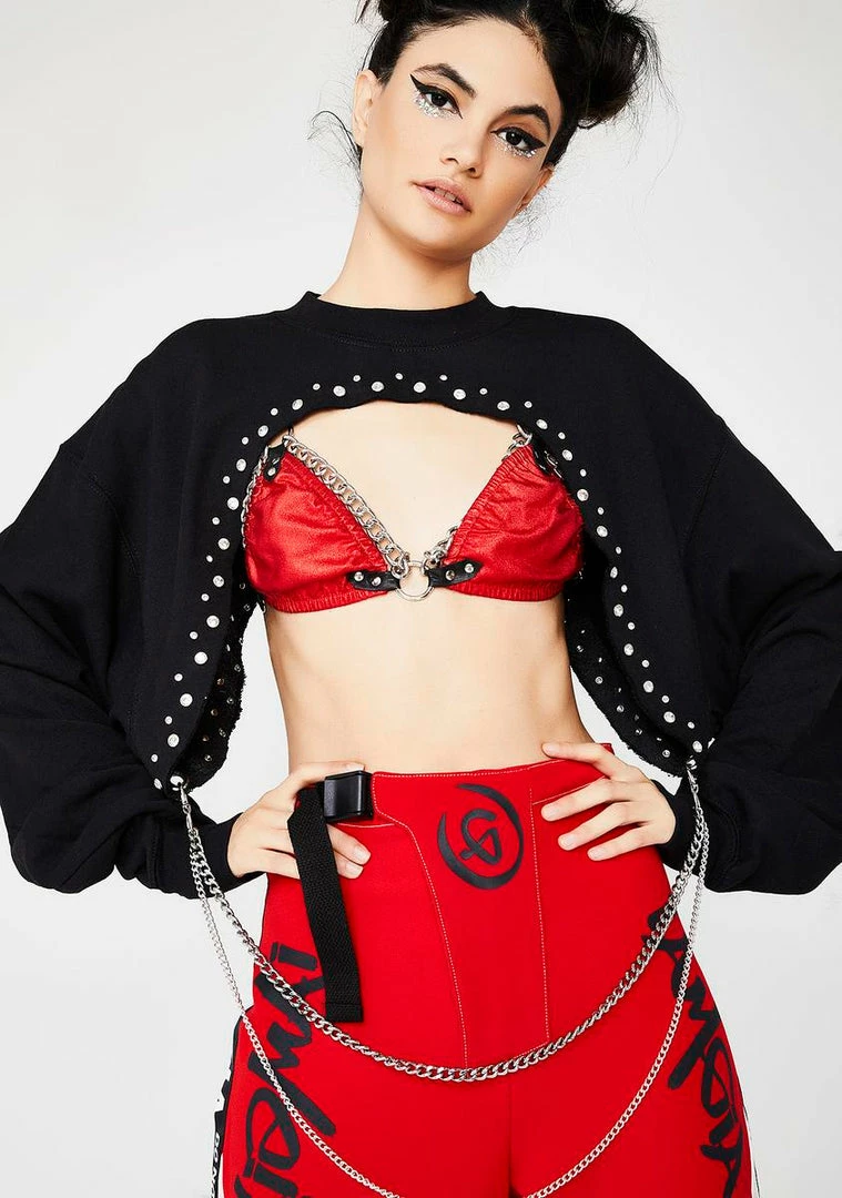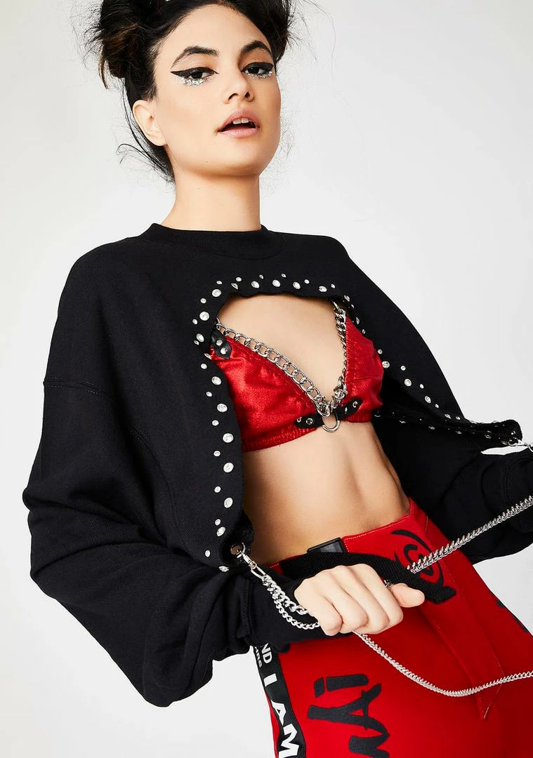 cuz youΓ’ΒΒre ready to show it all, bb. Be an open book with this cropped sweatshirt that has silver chain detailz NΓ’ΒΒ a studded trim.