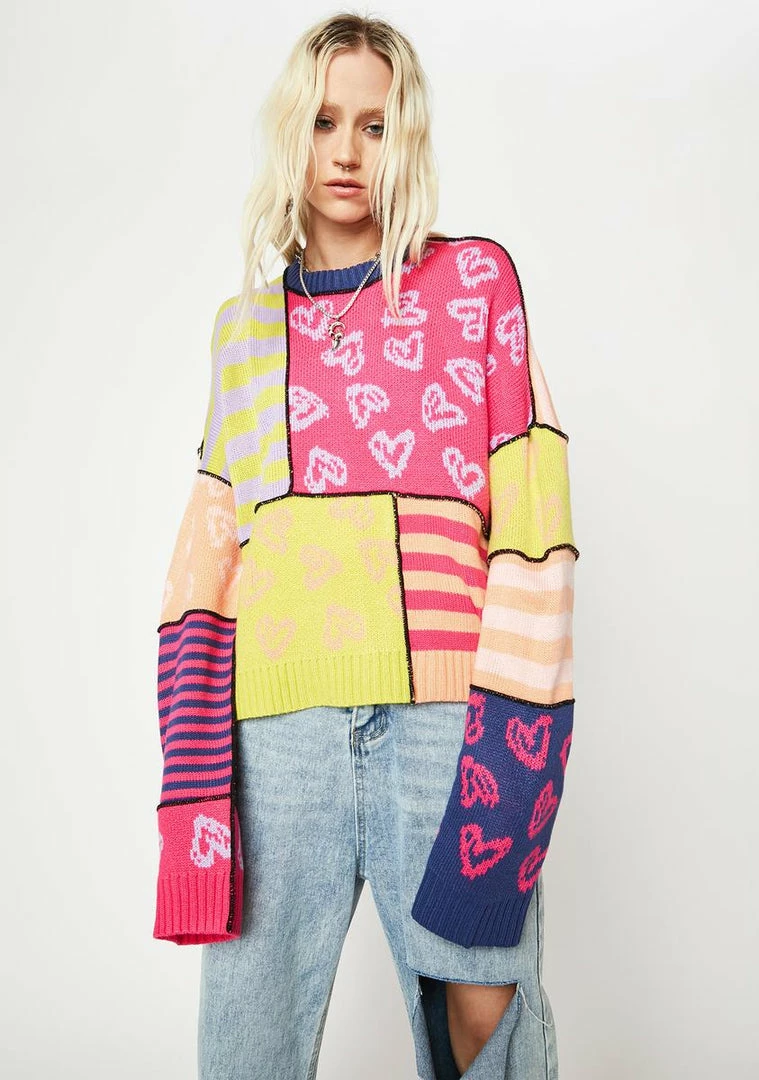 they want what they canΓ’ΒΒt have. This oversized knit sweater has a patchwork construction, mixed heart and stripe patterns, and contrast overlock seams.