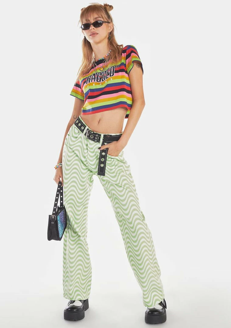 cuz you’re down to rage, babe. This crop tee has short sleeves, a rainbow stripe pattern all over, and logo graphics on the front.