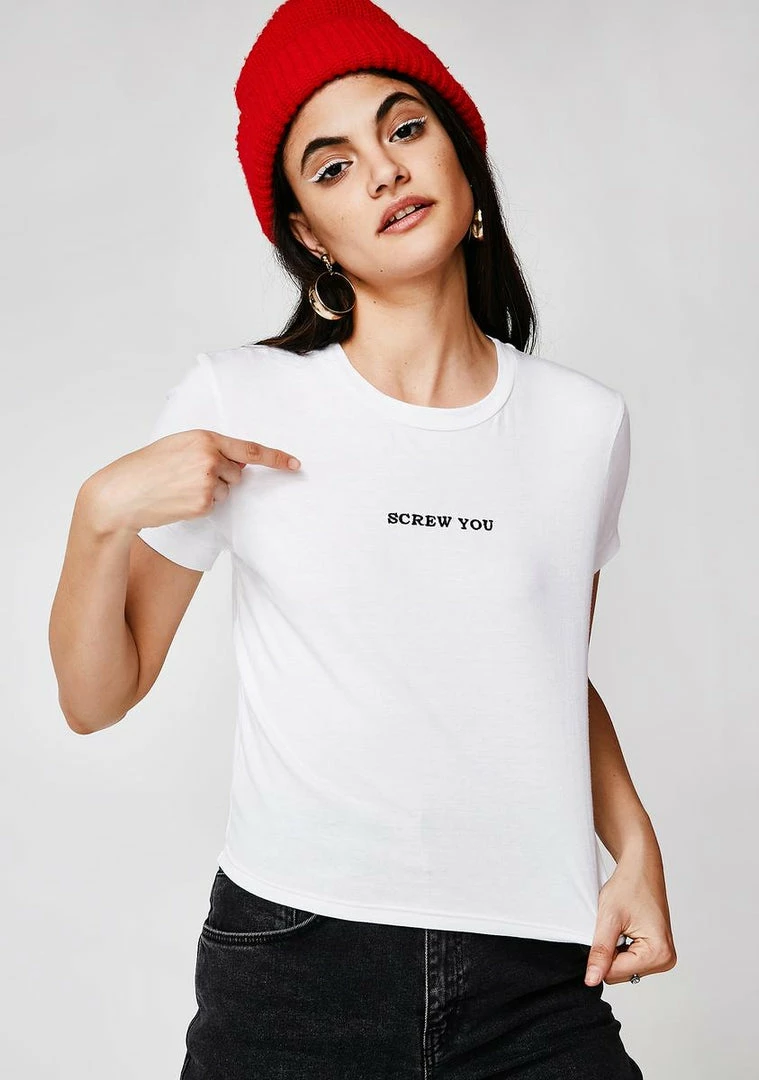 cuz sometimes you gotta let ’em know. This lil’ tee has short sleeves and says “SCREW YOU” on the front.