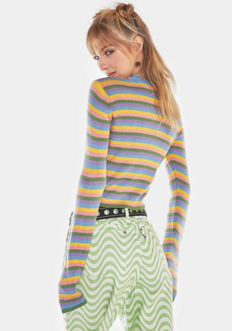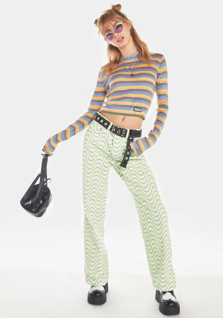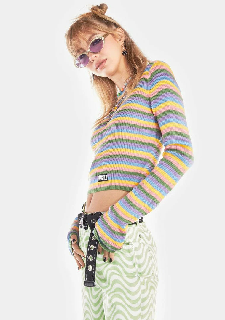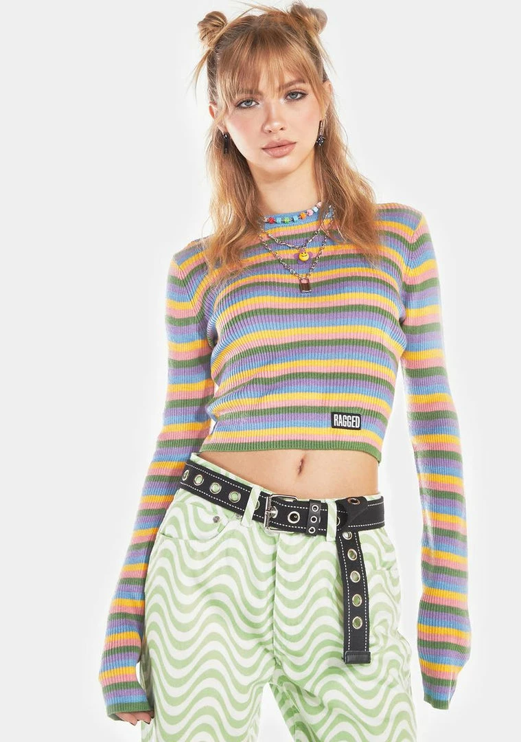 has a ribbed knit construction, a cropped waist, a contrast colored crew neckline, striped pattern, and a Ragged Priest logo patch at the hem.