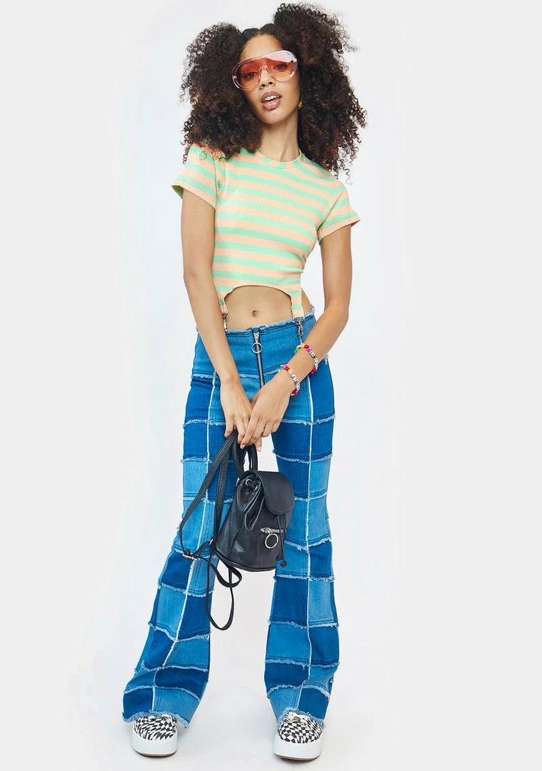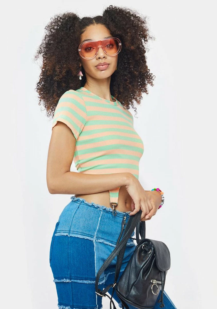 has a ribbed construction, short cap sleeves, a crew neckline, a cropped waist with garter straps & carabiner hardware, and a striped pattern.