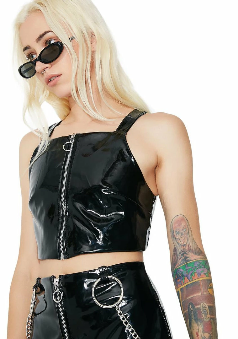 cuz you donΓ’ΒΒt want to blend in. This cute af patent black top has a front zipper closure and a cropped length.