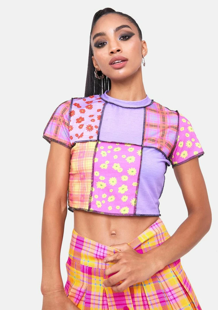 has a patchwork design with contrast colored exposed seams and floral & plaid patterned patches, a cropped waist, mock neck, and cap sleeves.