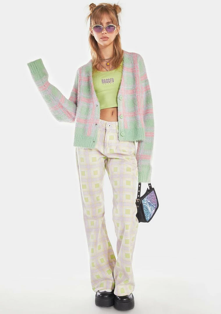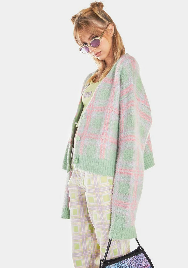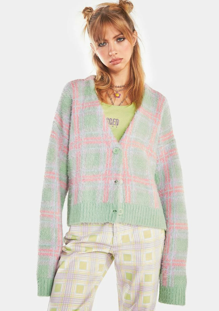 has a fuzzy eyelash knit construction, ribbed trim at the hem and cuffs, a plaid pattern all over, buttons up the front, and a Ragged Priest logo patch at the hem.