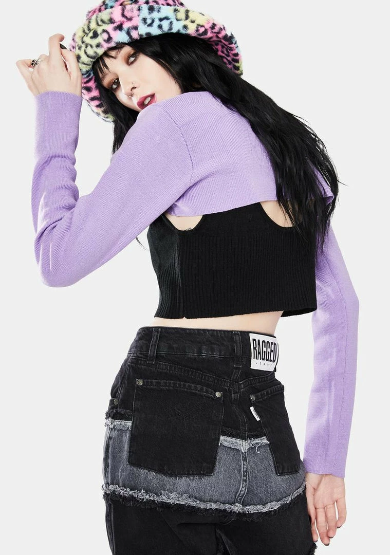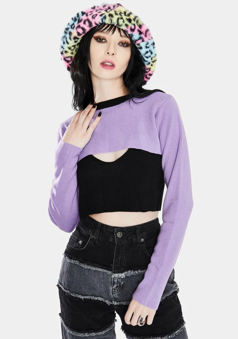 cuz you donΓ’ΒΒt give second chances. This double layer knitted crop top has a black tank contrast with a lilac long sleeve overlay.