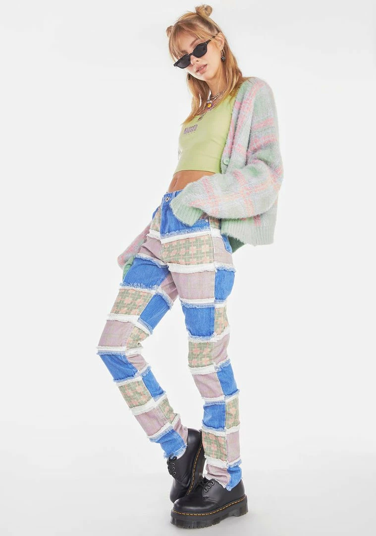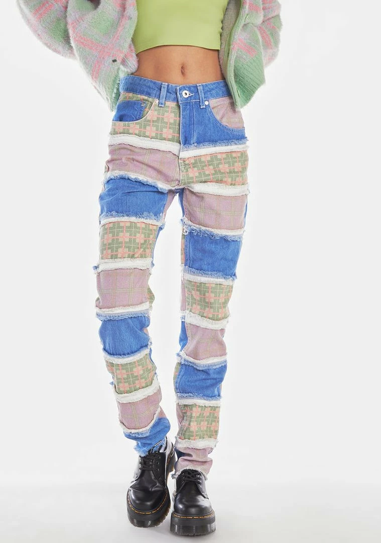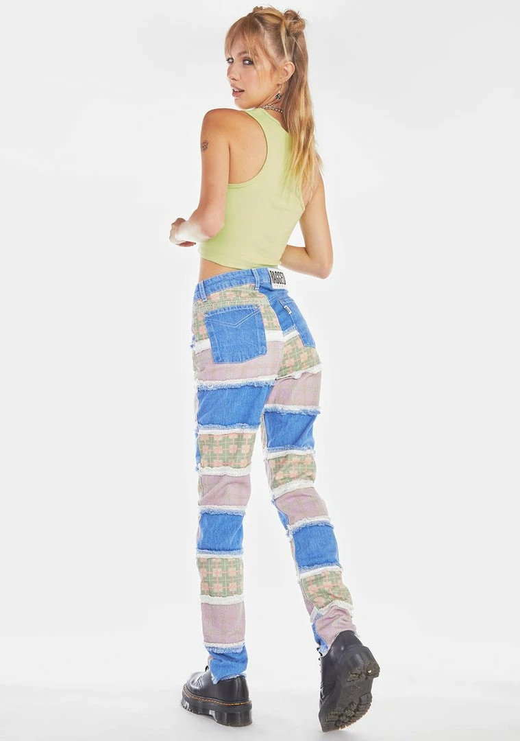 have a high rise waistline, a mom jean fit, a patchwork construction with exposed frayed seams, a multi plaid & denim design, and a Ragged Priest belt loop patch.