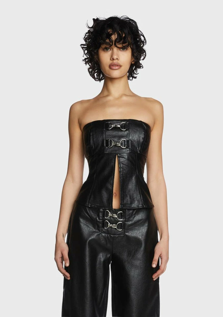cuz you’re too hot to handle! This bodice fit tube top has a vegan leather construction, clip hardware details, and a split front design.