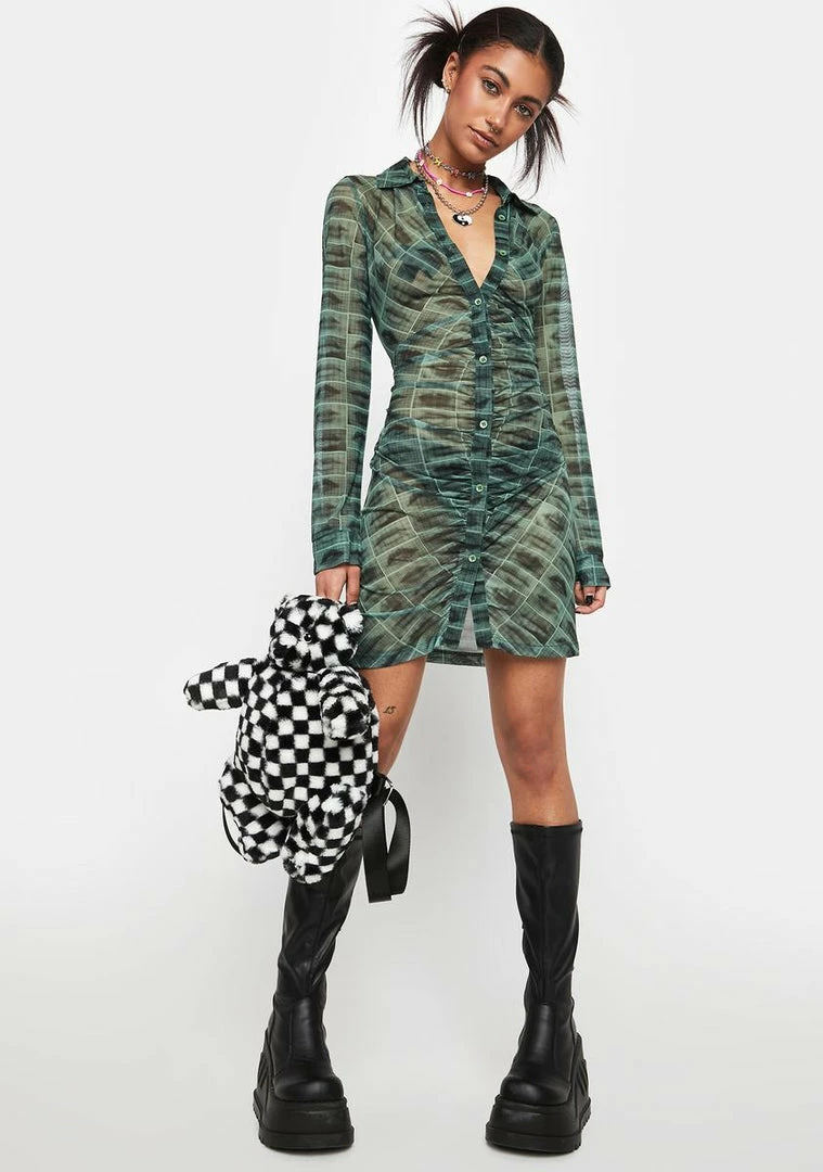cuz they gotta hear you out. This long sleeve shirt dress has a ruched mesh construction with a lips print all over, button up closures, a collar detail, and a stretchy bodycon fit.